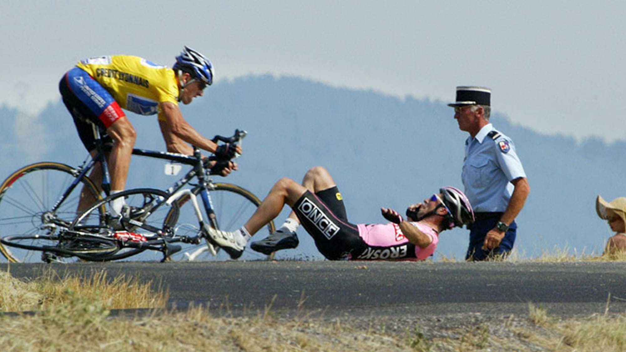 Lance Armstrong spotted Joseba Beloki's bike sliding on melted tar ahead. Tour de France 2003, stage to Gap, scorching heat had turned the road treacherous. As Beloki crashed, Armstrong faced a split-second decision. In an incredible display of bike handling, he veered right, straight down a steep field, across a ditch, and back onto the road below. A moment that showcased cycling's unpredictability and the incredible skills of its athletes.